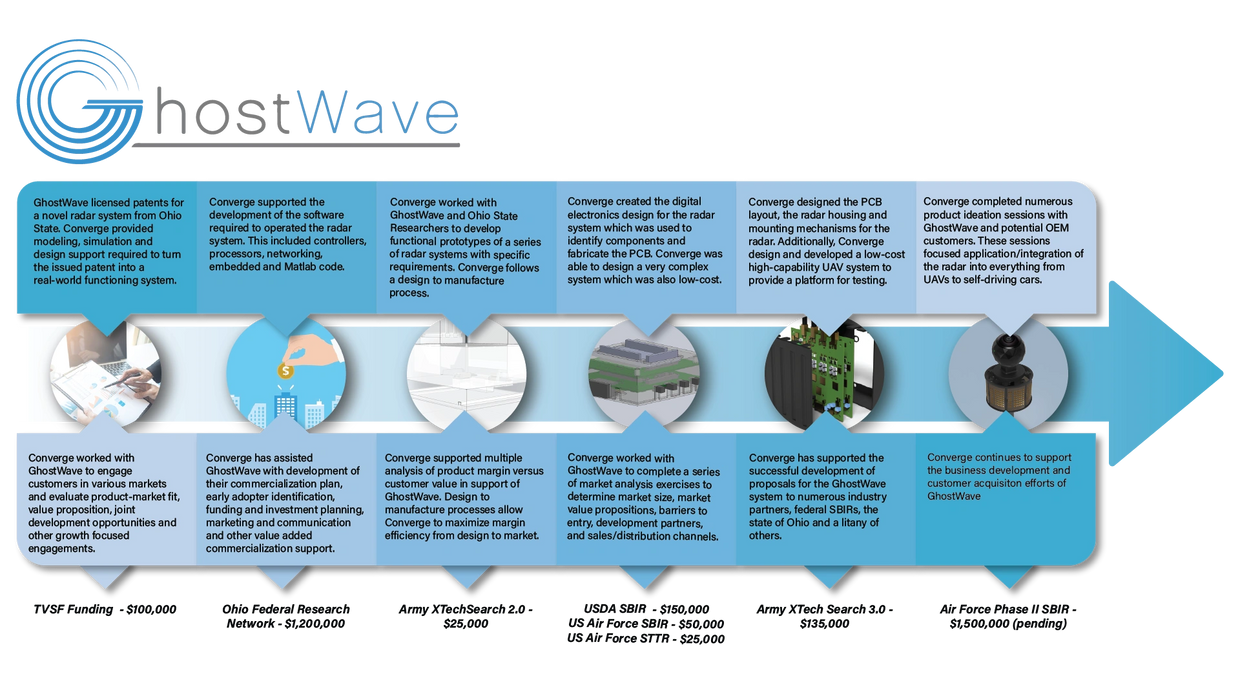 Converge Technologies has an ongoing support relationship with the high-tech start-up Ghostwave, a revolutionary radar system immune to interference. Converge has provided engineering design, technology validation, business development services and a litany of other support in commercialization of this technology.